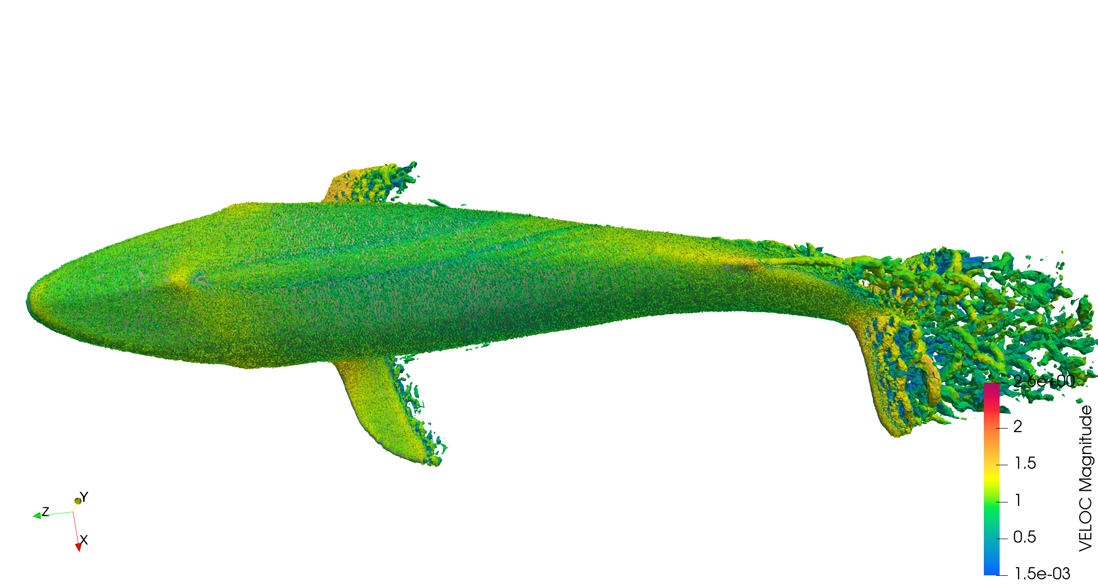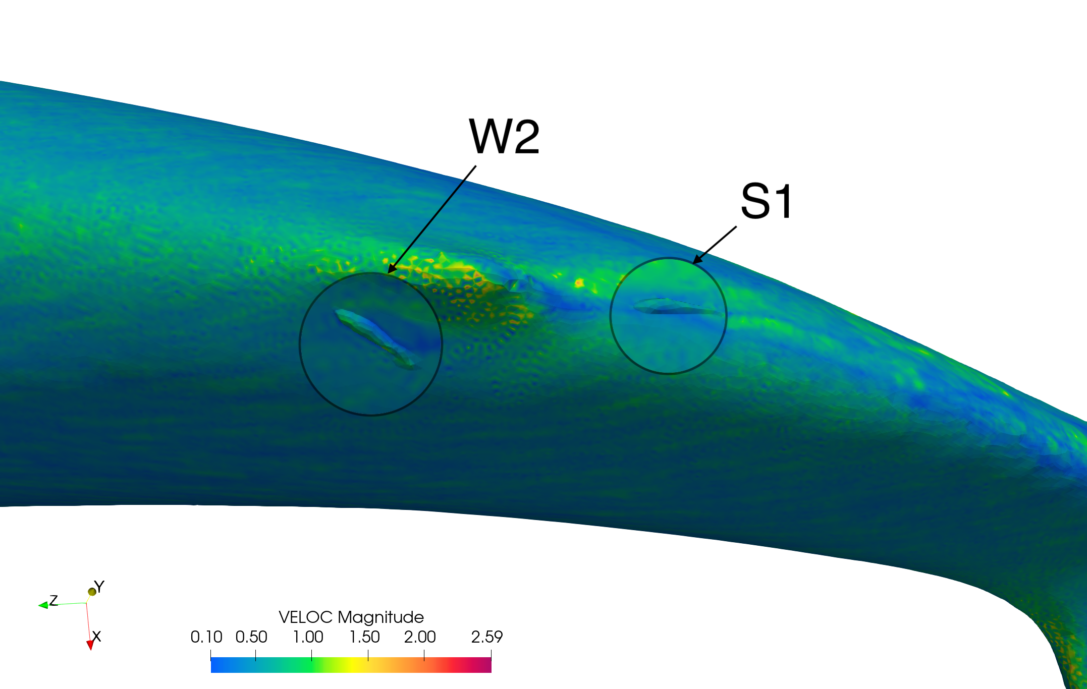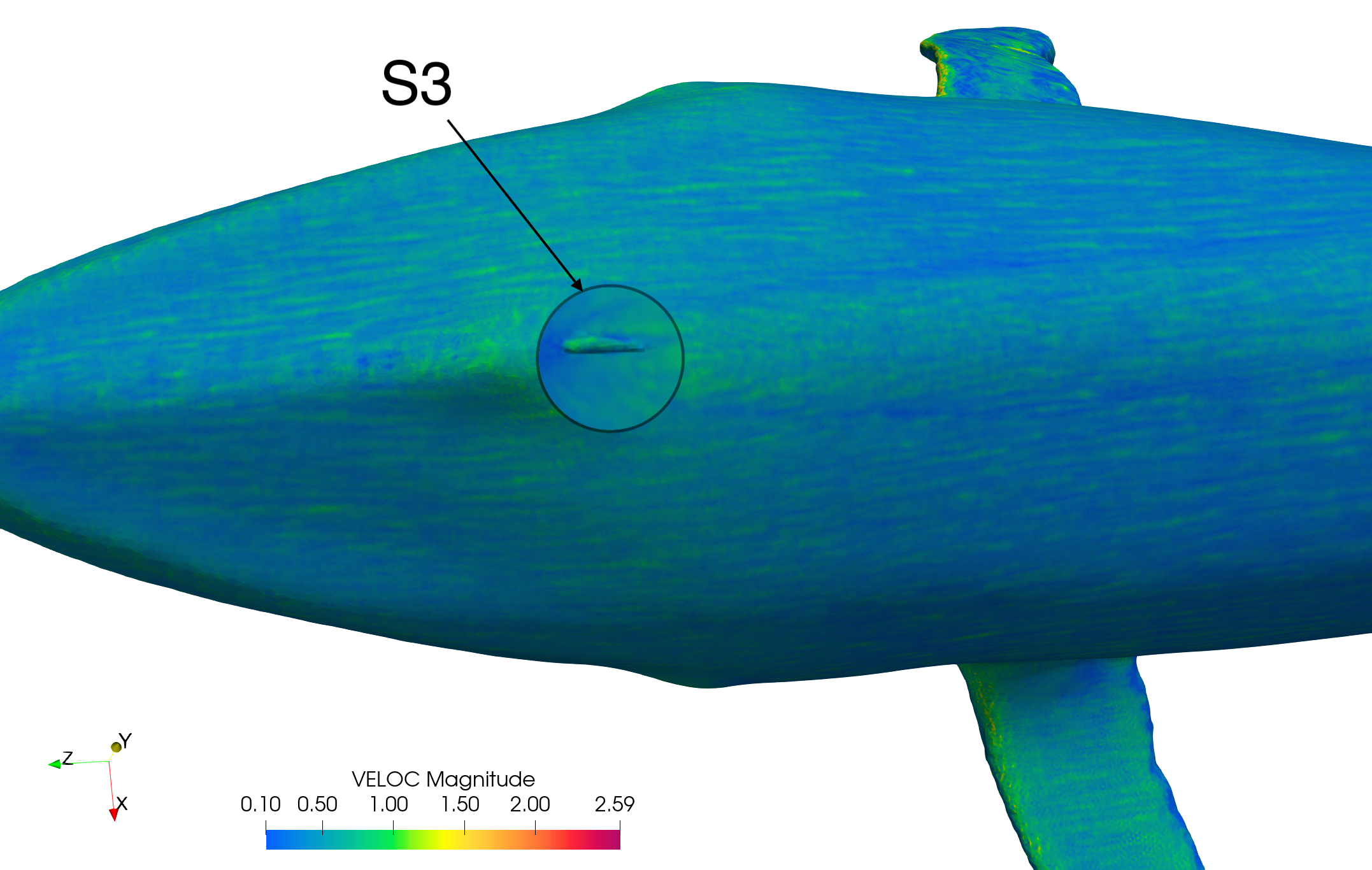 Animal-borne video recordings from blue whales in the open ocean show that remoras preferentially adhere to specific regions on the surface of the whale. Using empirical and computational fluid dynamics analyses, we show that remora attachment was specific to regions of separating flow and wakes caused by surface features on the whale. Adhesion at these locations offers remoras drag reduction of up to 71–84% compared with the freestream. Remoras were observed to move freely along the surface of the whale using skimming and sliding behaviors. Skimming provided drag reduction as high as 50–72% at some locations for some remora sizes, but little to none was available in regions where few to no remoras were observed. Experimental work suggests that the Venturi effect may help remoras stay near the whale while skimming. Understanding the flow environment around a swimming blue whale will inform the placement of biosensor tags to increase attachment time for extended ecological monitoring (Flammang et al., 2020).